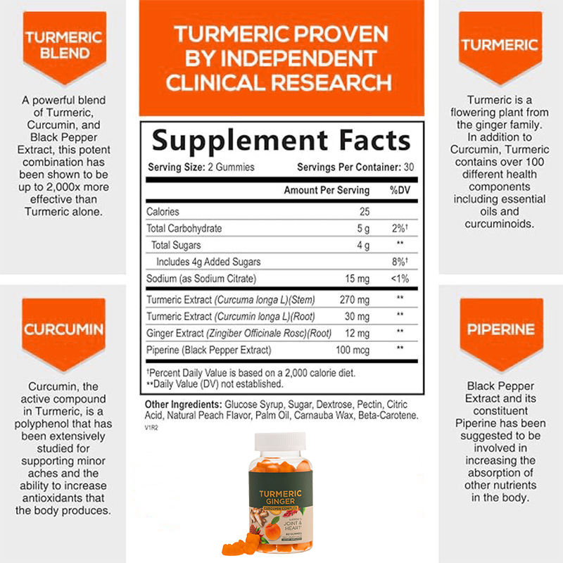 Gommes au curcuma et au gingembre de marque privée OEM Supplément au curcuma et au gingembre pour un soutien immunitaire santé de la peau et des articulations