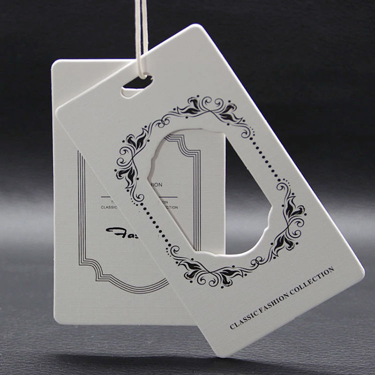Étiquettes suspendues en papier couché recyclé avec logo imprimé sur mesure OEM, motif gaufré, pour sacs, chaussures, vêtements