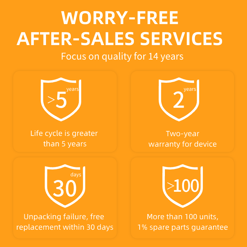 Centre d'appels et Support technique en ligne, Formation sur site et D'inspection, Pièces de rechange gratuites, Le retour et le Remplacement, Réparation