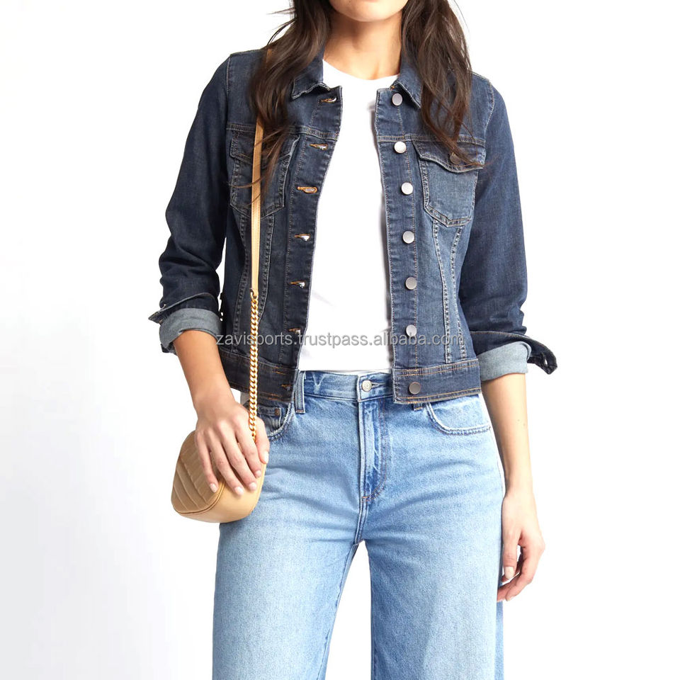 Veste en jean pour femme, style bouton, couleur bleu uni, logo personnalisé, tissu en coton, surdimensionnée, respirante, services OEM