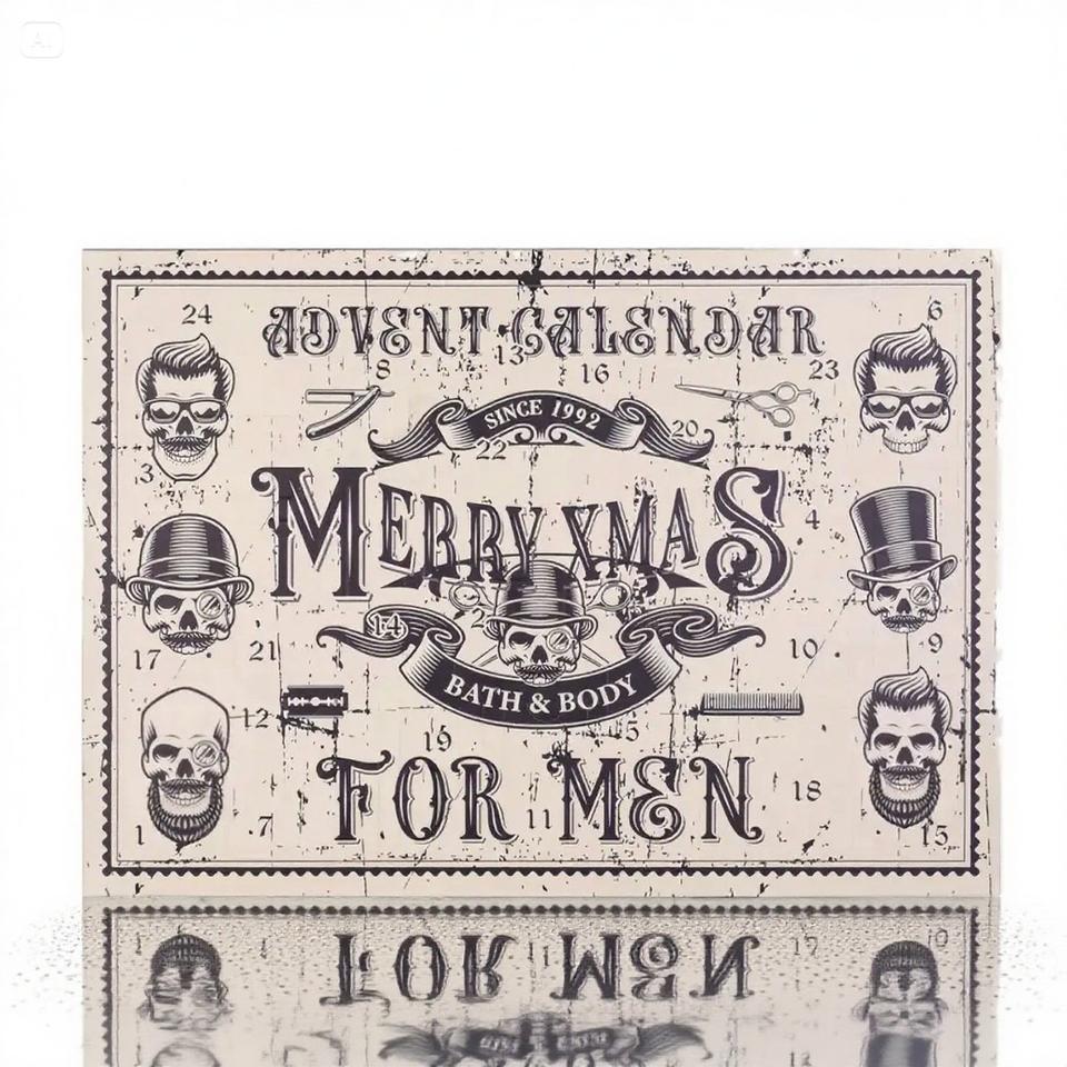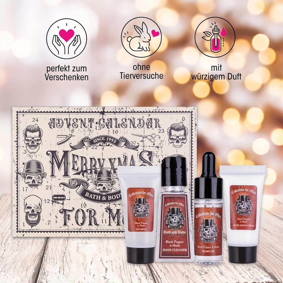 Calendrier de l'Avent OEM élégant pour hommes, design tête de mort, avec 24 surprises beauté et bien-être, coffret cadeau nourrissant au beurre de karité