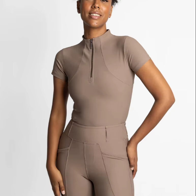 Haut de base pour l'équitation pour femmes OEM, coupe athlétique, manches courtes, tissu respirant, hauts d'équitation personnalisés