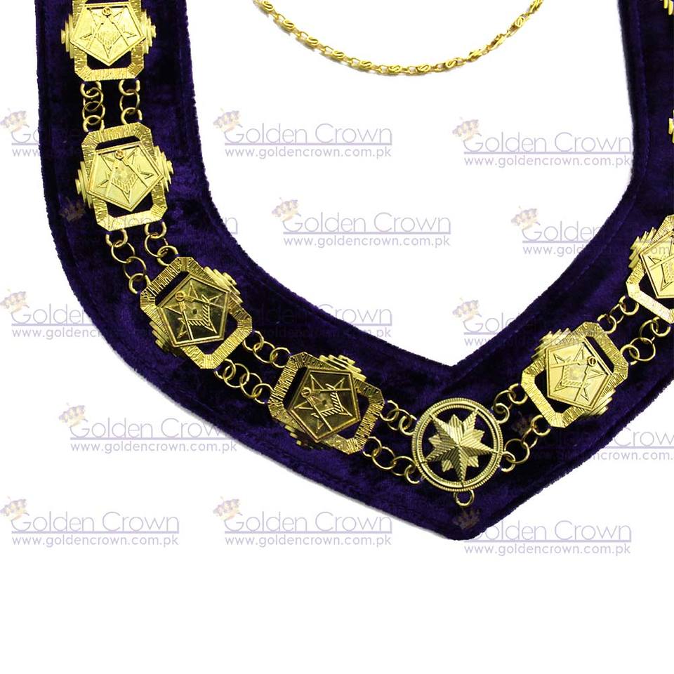 OES-Collier de chaîne carrée boussole maçonnique-Or sur velours violet | Fournisseur de colliers de chaîne maçonniques
