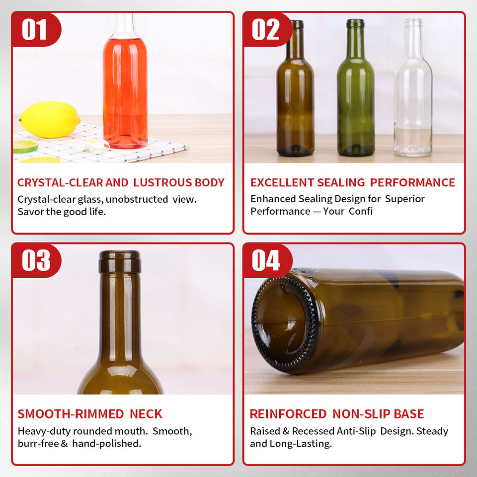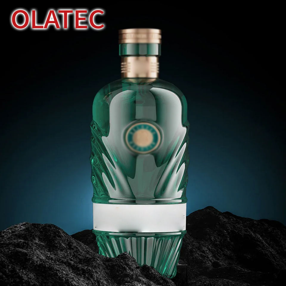 Ensemble de bouteilles en verre personnalisées OLATEC avec motifs gaufrés dégradés et badges métalliques pour l'exportation mondiale, prêt pour les spiritueux et les vignerons