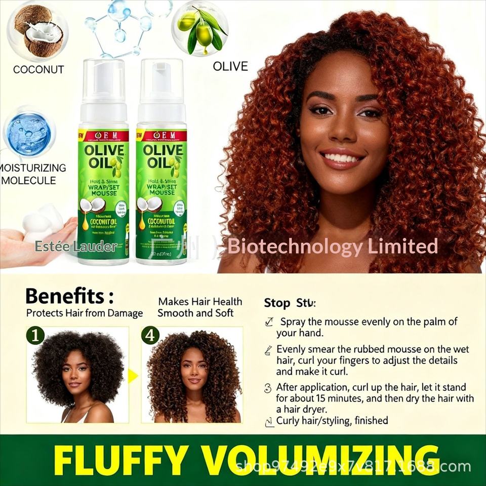 Mousse coiffante à tenue forte à l'huile d'olive et à la noix de coco pour cheveux bouclés - Hydratante et séchage rapide