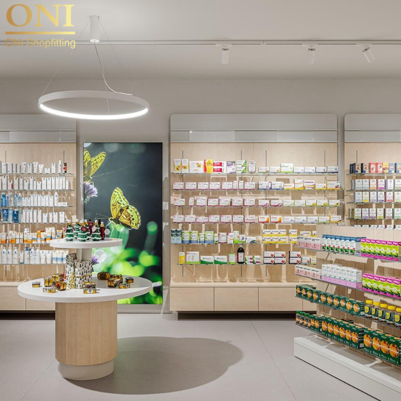ONI Shopfitting Comptoir de pharmacie de style bois original Meuble de présentation Magasin médical Bureau de caissier Comptoir de pharmacie