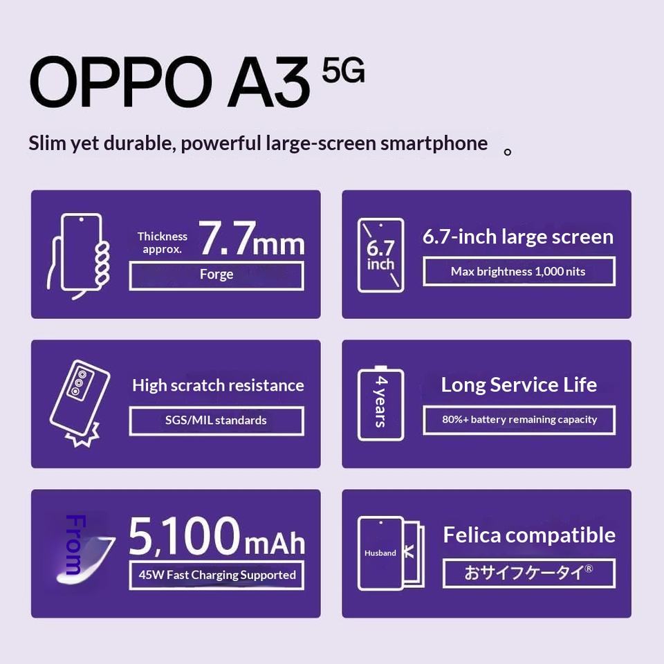 Smartphone OPPO A3 5G Version Japonaise Sans Carte SIM Écran LCD 1,7 Pouces 50MP 120Hz Batterie 5100mAh Charge Rapide 45W FeliCa