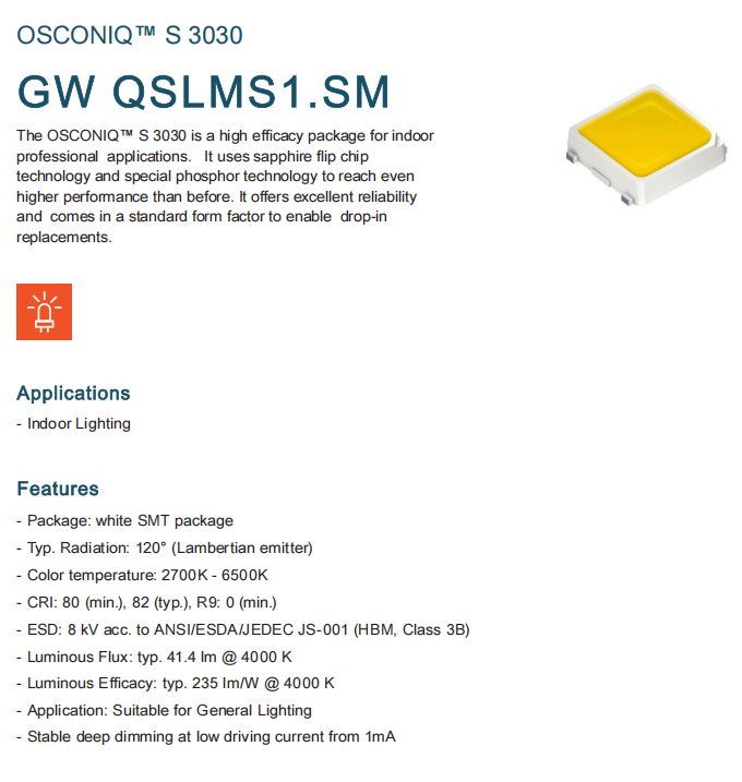 La température de couleur (le TDC):2700 mille, 3000 mille, 3500 mille, 4000 mille, 5000 mille, 5700 mille, 6 500 000