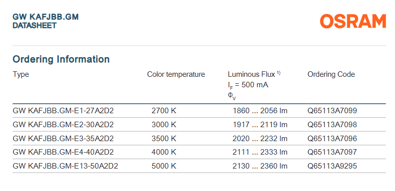 La température de couleur (le TDC):3000 milliers, 4000 mille, 5000 milliers, 2700 milliers, 3500 milliers