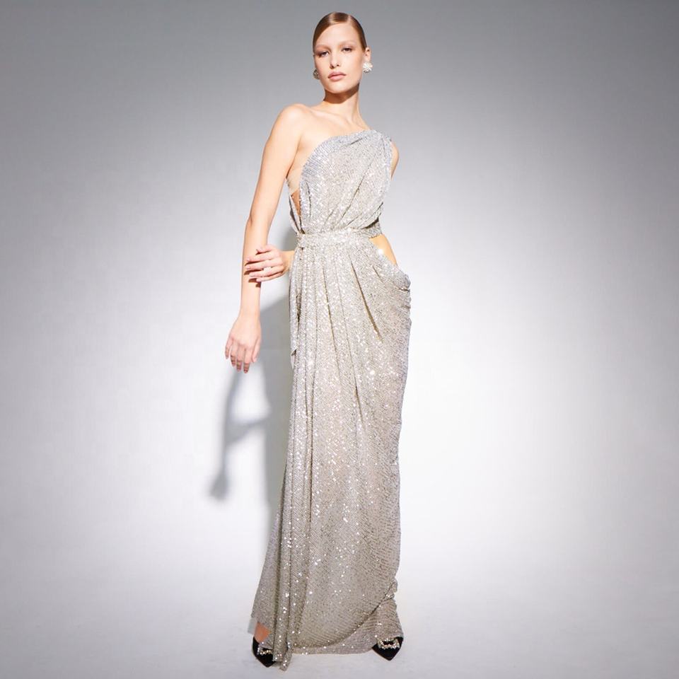 OUDINA – robe longue à paillettes pour femmes, nouveau Style, épaule oblique argentée, asymétrique, élastique, fête