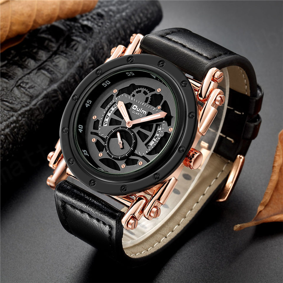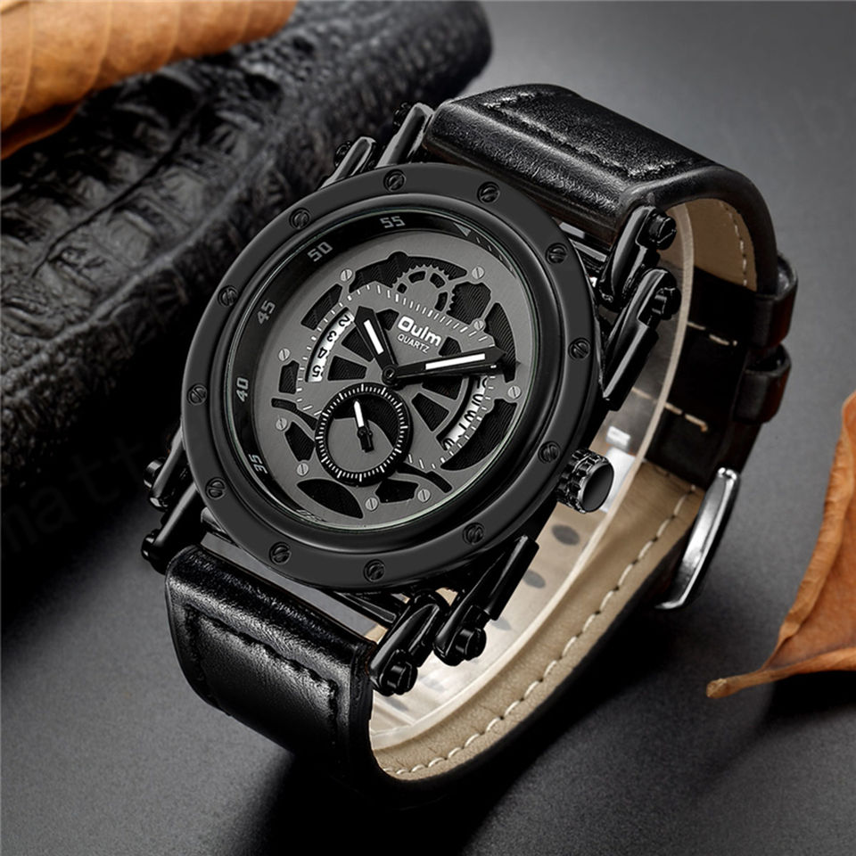 OULM 3399 Fashion Antique Business Hollow Design Quartz Chronograph Stainless Steel Case Leather Strap Men's Watch