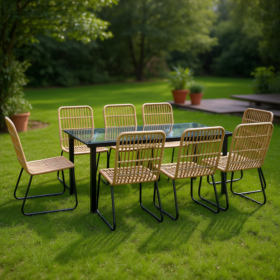 Ensemble de salle à manger en acier et rotin poly noir et chêne avec table en verre, mobilier de jardin extérieur 6 places, style contemporain, résistant aux intempéries
