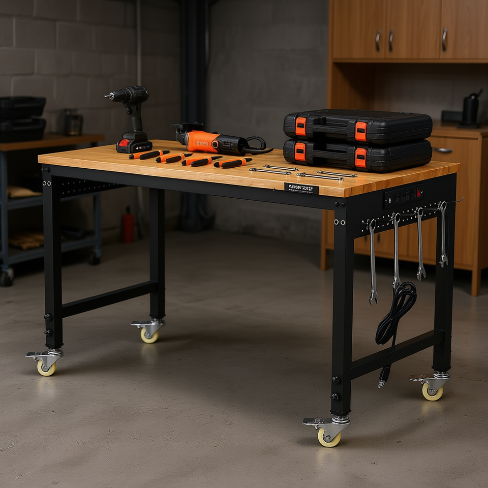 Plan de travail en bois de chêne de 48 pouces avec pieds métalliques réglables, roulettes et prise de courant – Mobilier de bureau industriel