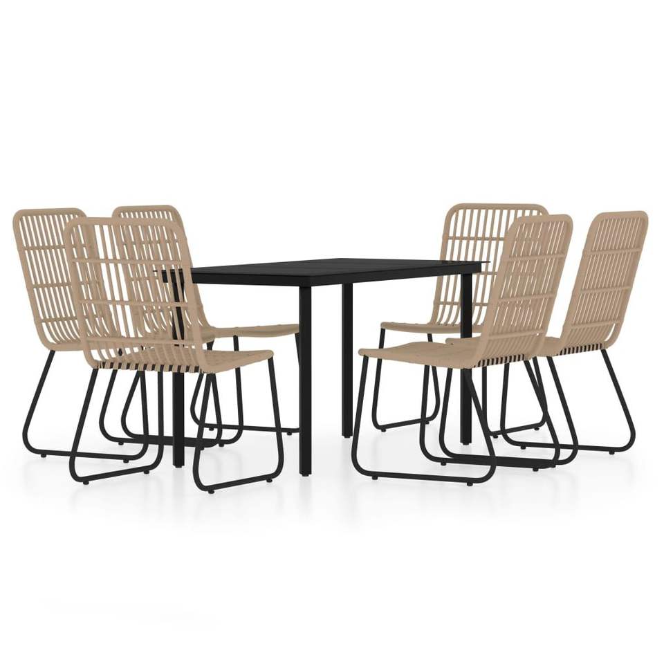 Ensemble de salle à manger en rotin PE noir et chêne avec verre en acier thermolaqué pour usage extérieur