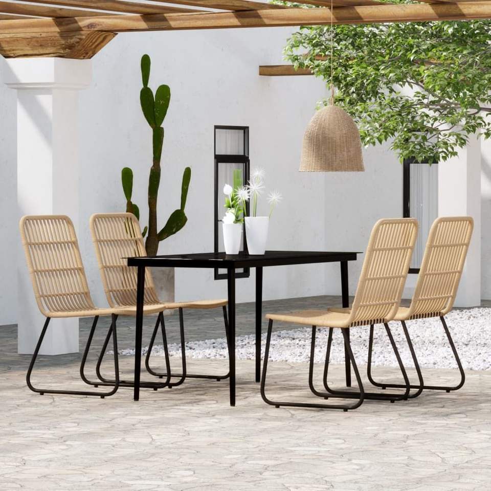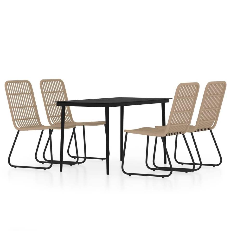 Ensemble de salle à manger en rotin noir et chêne avec structure en acier thermolaqué et plateau en verre pour usage extérieur, mobilier de jardin, style contemporain