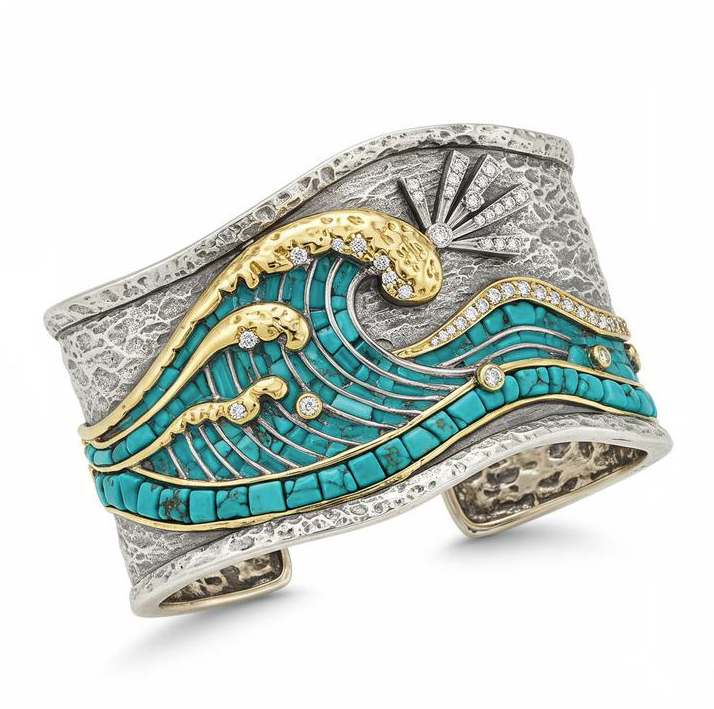 Bracelet manchette Ocean Wave et Sunset Design Bracelet en or argenté fin fabriqué à la main avec détail de surf Bracelet large inspiré de la nature