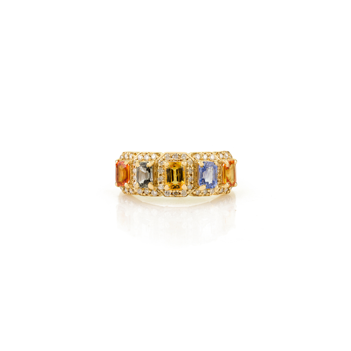 Bague octogonale en forme de multi saphir et diamant rond Halo demi-éternité or jaune pur 14 carats pierre de naissance fournisseur de bijoux