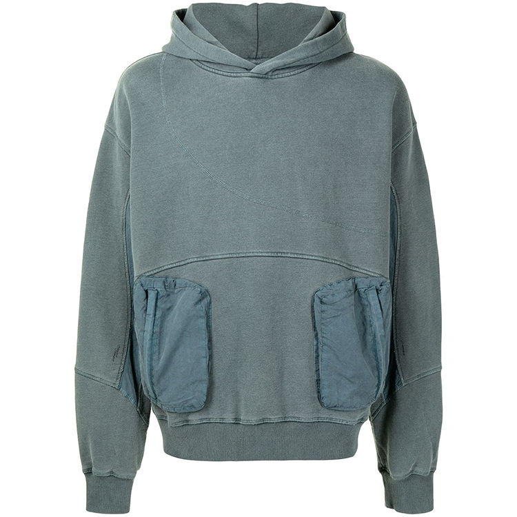 Oem Capuche Vintage Blue Street Wear Hoodies Custom Logo Acid Washed Oversized Cargo Pockets Distressed Reverse Weave Hoodie