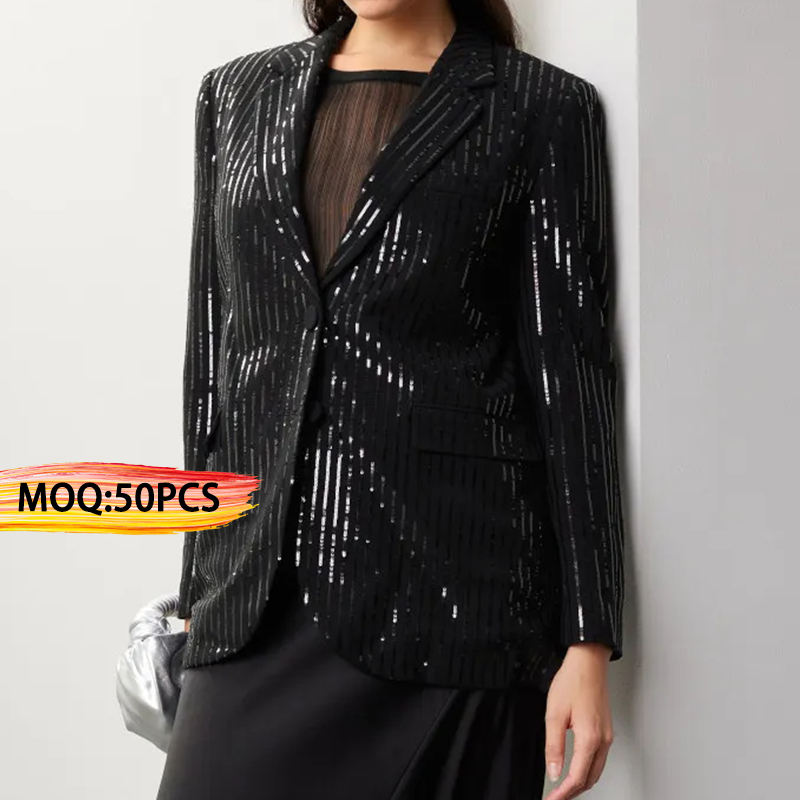 Veste blazer pour femmes OEM personnalisé petit quantité minimale de commande revers cranté manches longues noir à sequins simple boutonnage sur mesure pour le travail d'affaires
