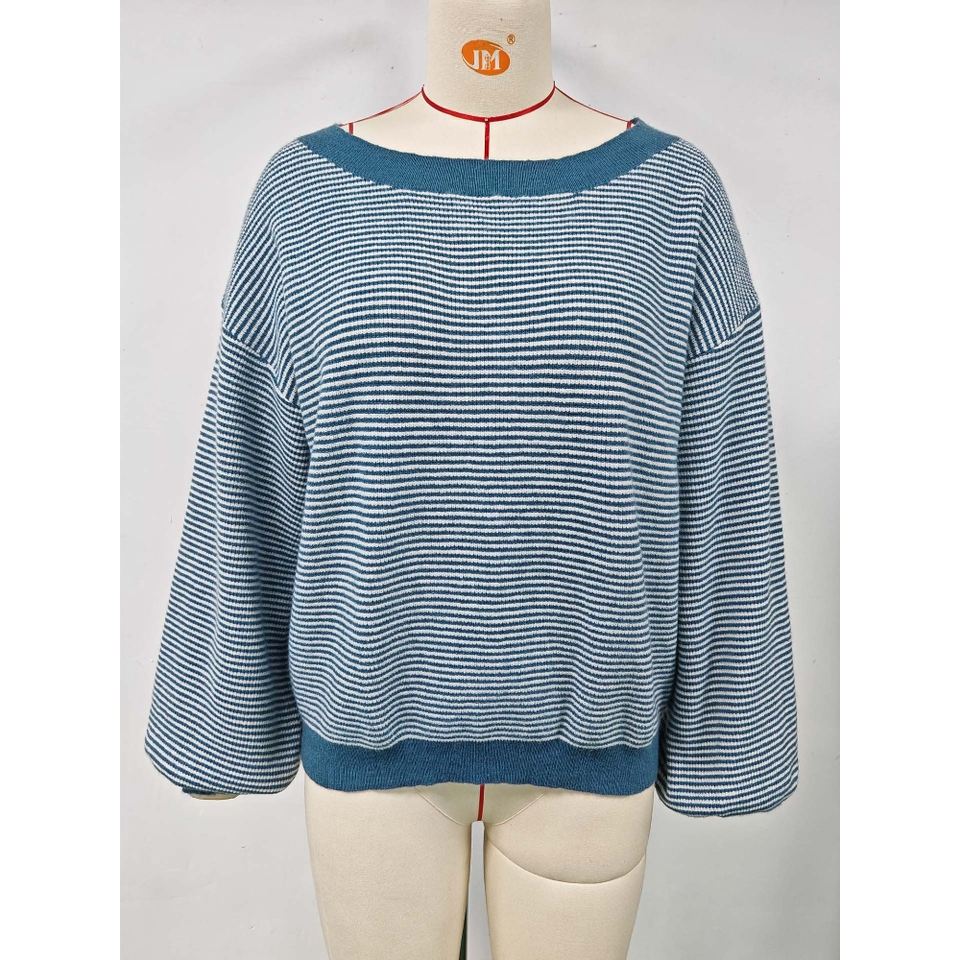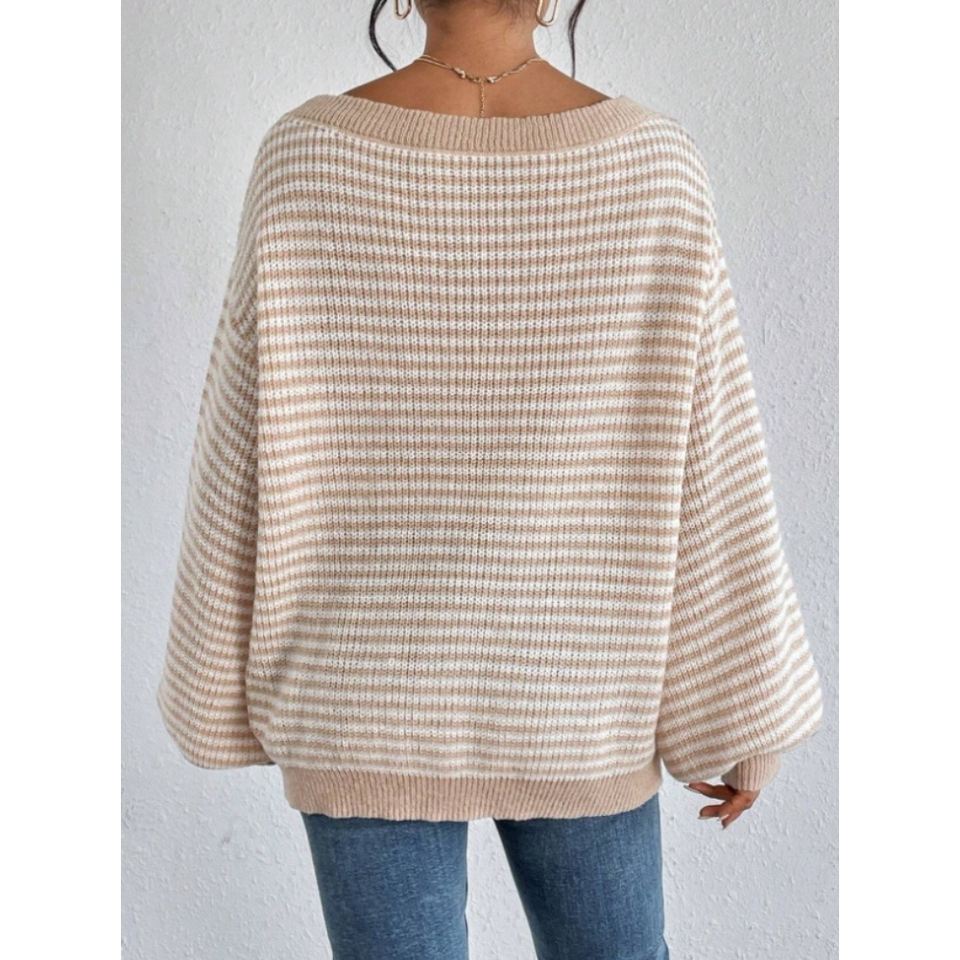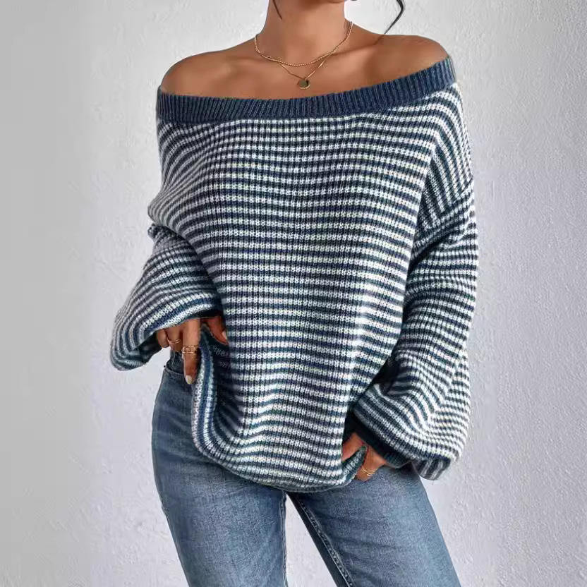 Pull en maille pour femme à épaules dénudées, à rayures contrastées et manches lanternes, mode