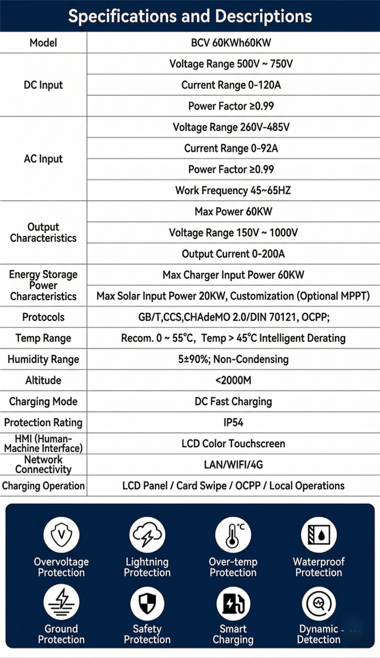 Chargeur de Véhicules Électriques Solaire Hors Réseau 60 kWh Tout-en-un avec Pile de Recharge Rapide DC CCS2 GBT et Application OCPP pour Utilisation Extérieure et en Zone Éloignée