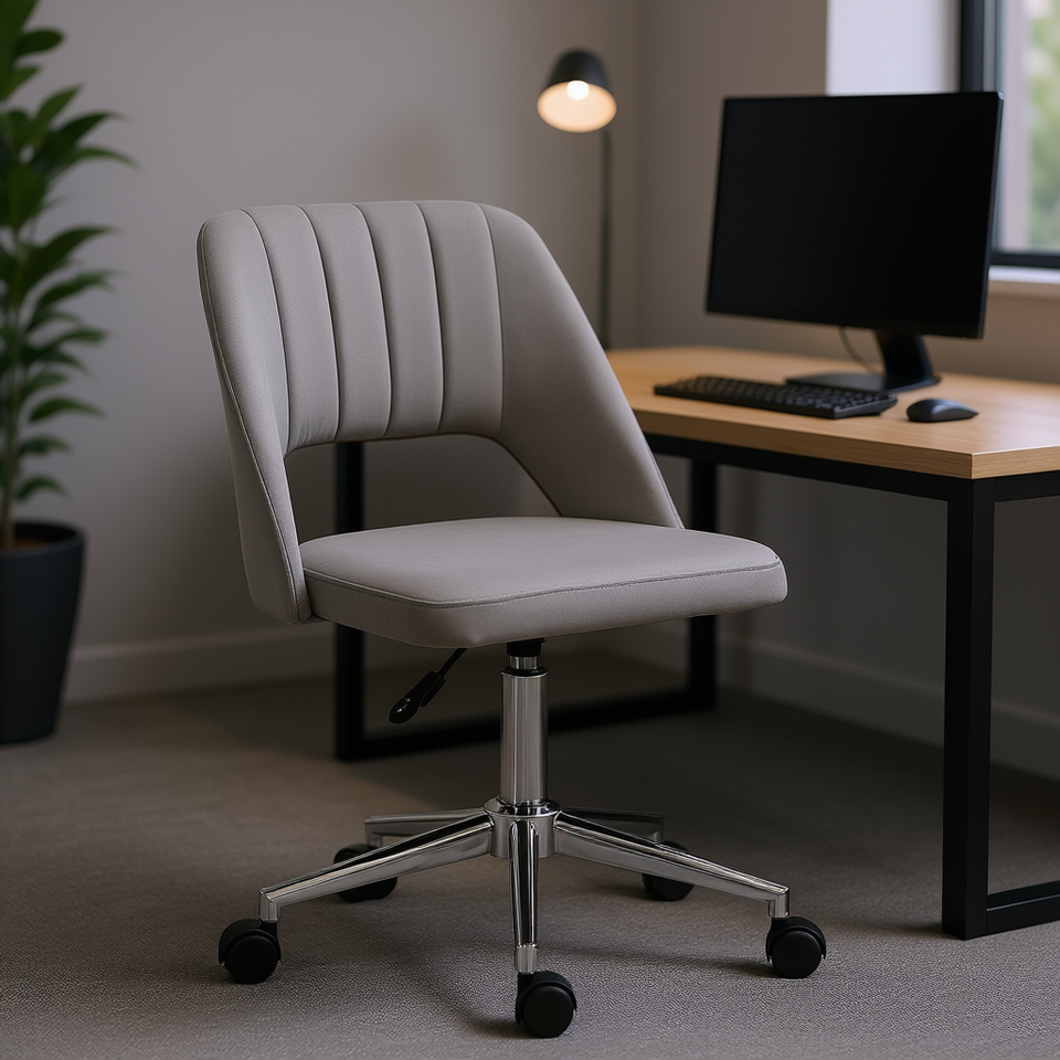 Chaise de bureau à dossier moyen, style exécutif, en cuir PU gris, base chromée, pivotante, réglage manuel, style contemporain