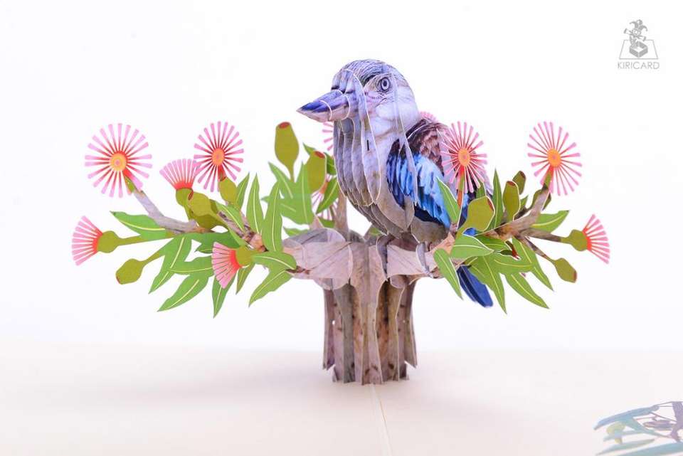 Carte pop-up multicolore imprimée offset 15x20 avec un oiseau kookaburra riant, belle carte artisanale en papier pour mariage, Noël, anniversaire