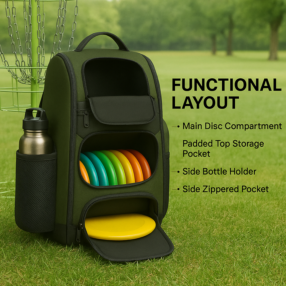 Sac à dos de golf à disque vert olive et noir avec grande housse de pluie imperméable et sangles rembourrées pour les disques de frisbee ultimes