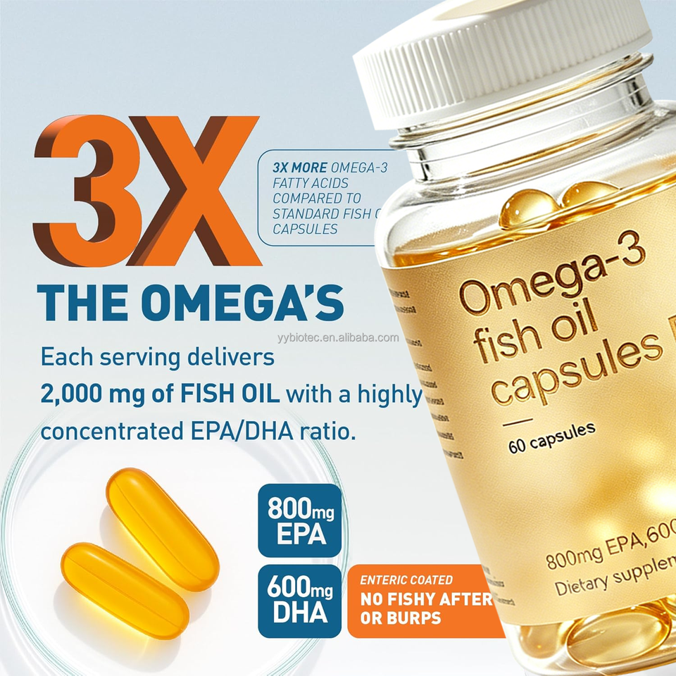 Huile de poisson Oméga 3 2000mg Triple Concentration 800mg EPA 600mg DHA Compléments pour le soutien du cœur, du cerveau et du système immunitaire Capsules d'huile de poisson