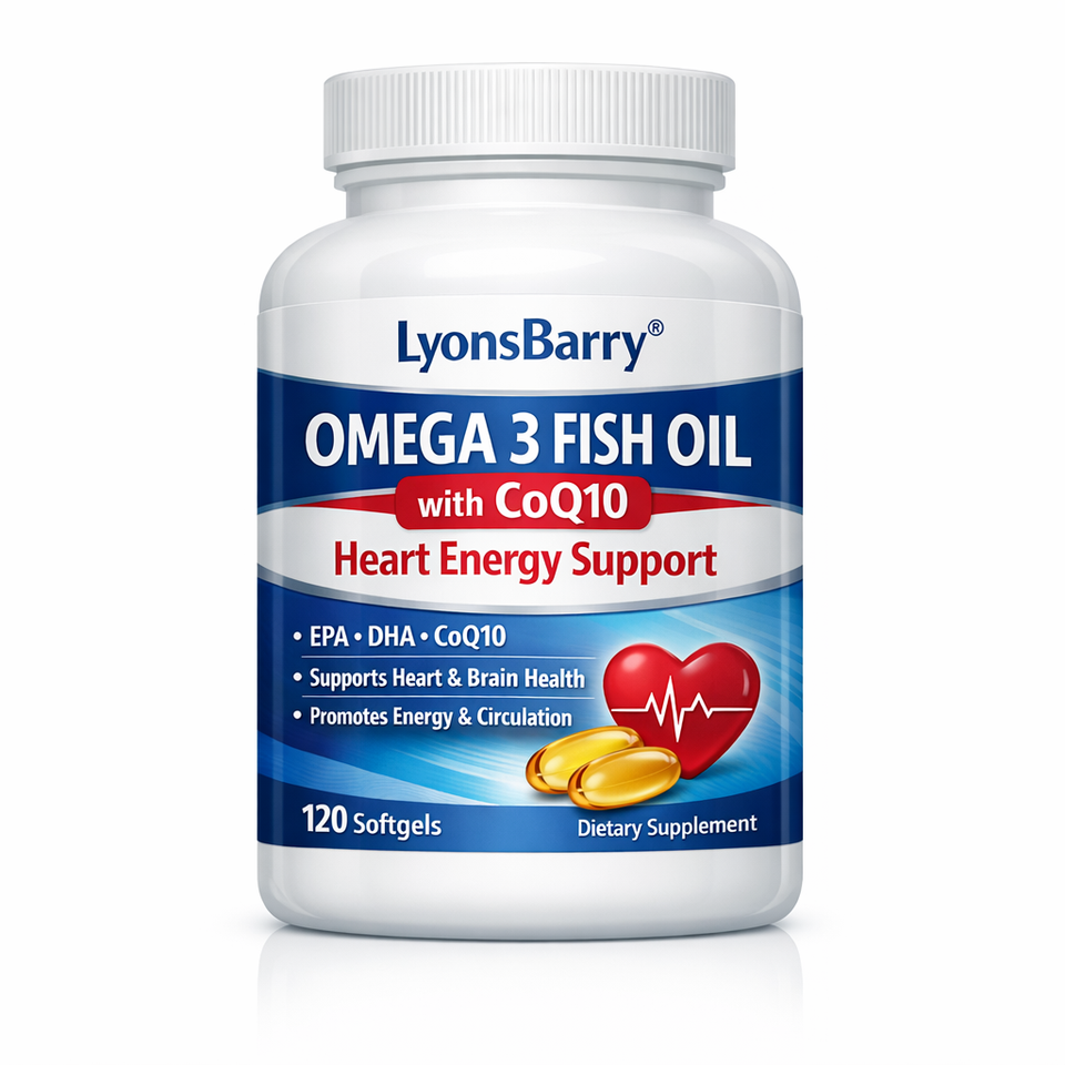 Huile de poisson Oméga 3 avec CoQ10 en capsules molles 500mg Soutien cardiaque et énergétique Sans gluten LyonsBarry Fabricant OEM GMP