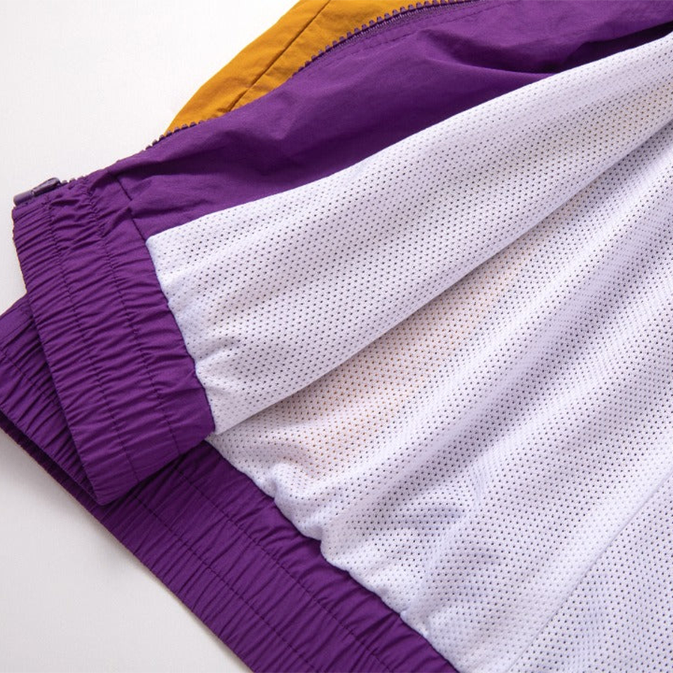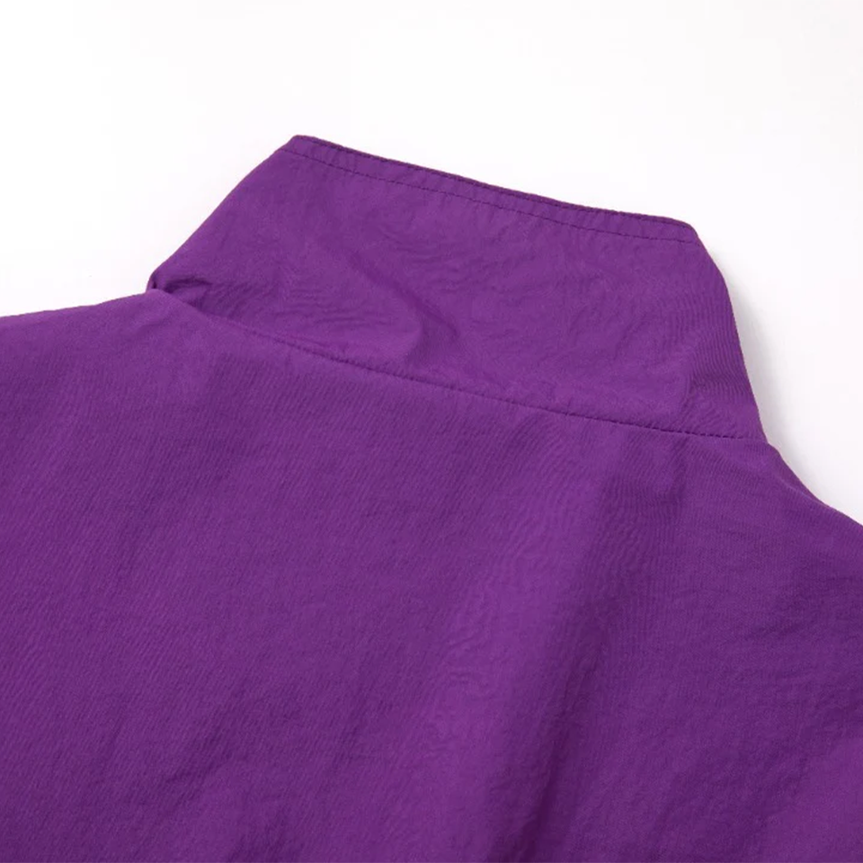 Veste coupe-vent à capuche Omega Purple & Gold Plus Size imprimée, résistante aux intempéries, avec fermeture éclair intégrale, poignets élastiques, poches passepoilées et col montant