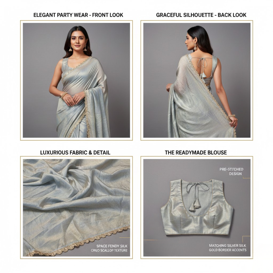 Sari en soie Fendy argenté pré-cousu, prêt à porter en une minute, avec finition fluide et chemisier prêt-à-porter | Tenue de soirée élégante