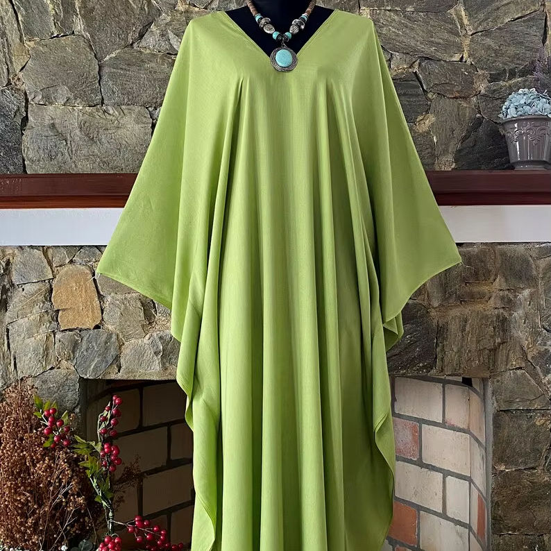 One Size Hand Dyed Light Green Rayon Kaftan Maxi V Neck Dress