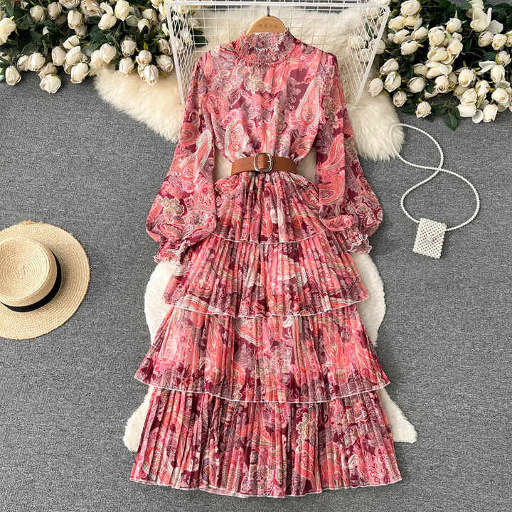 Robe longue à col montant en maille à manches longues à volants imprimée à taille unique, robe ample à manches lanternes, robe longue à volants