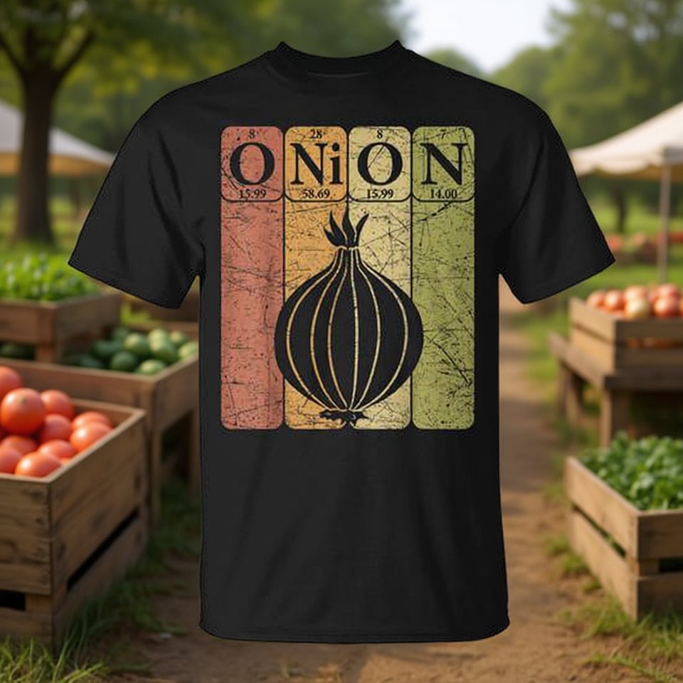 T-shirt rétro pour agriculteur avec les éléments de la table périodique des légumes et des oignons