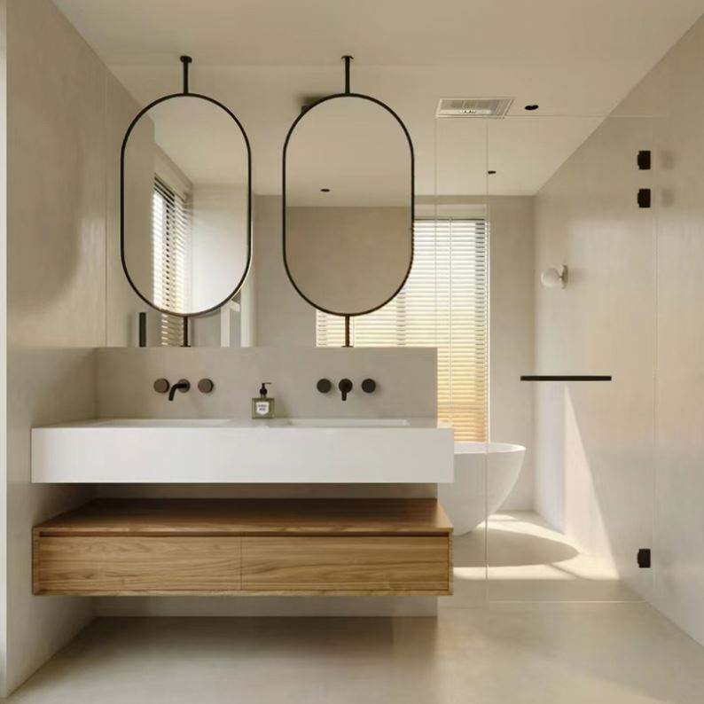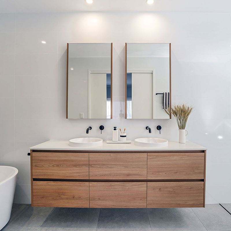 Ensemble de meuble-lavabo de salle de bain en bois avec miroir de maquillage double évier technique en ligne, cadre en métal, montage mural