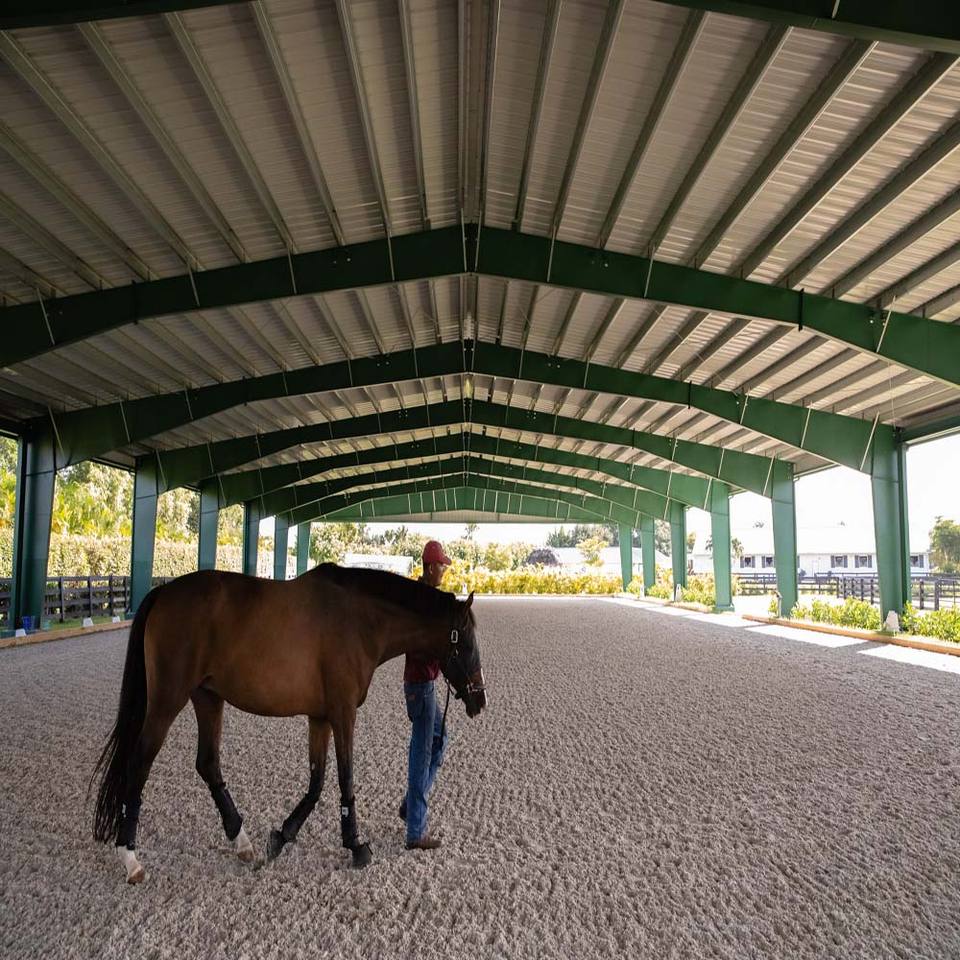 Manège ouvert/fermé en structure acier, à portique préfabriqué à travée libre, pour sports équestres