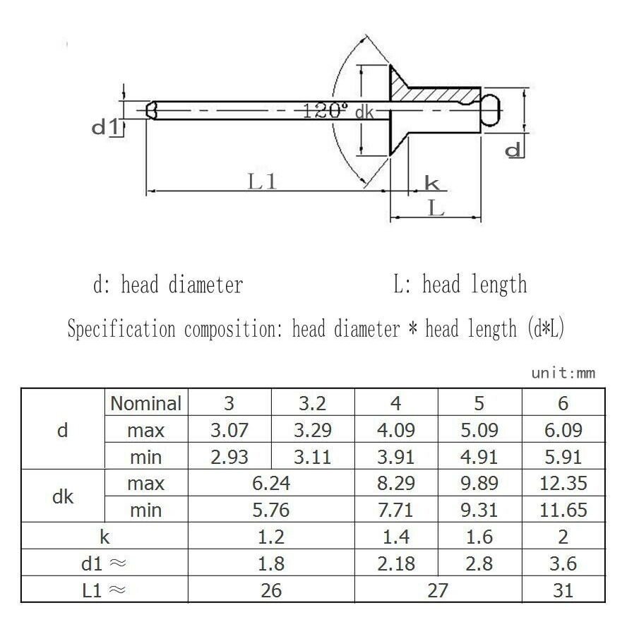 Diamètre du rivet:2mm 2.4mm 3mm 3.2mm 4mm 4.8mm 5mm 6mm 6.4mm