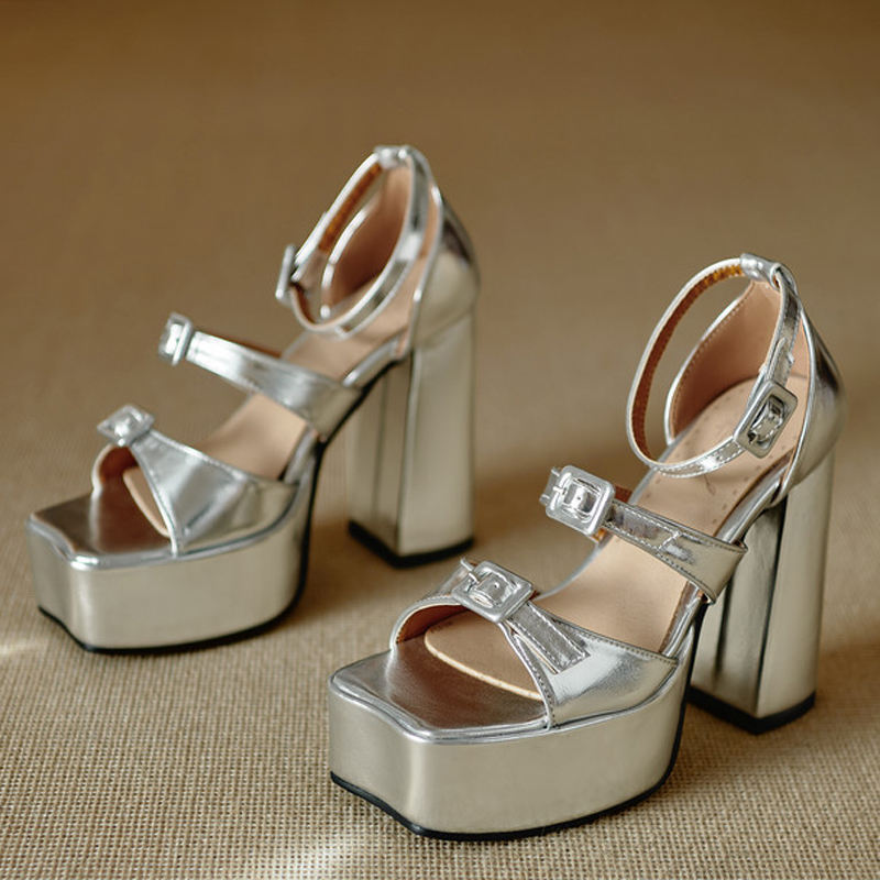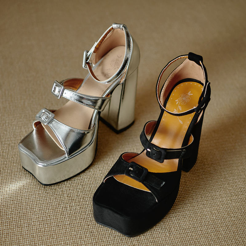 Escarpins à bout carré ouvert avec boucles, sandales à plateforme épaisse, talons hauts et épais, chaussures sexy pour femmes grandes tailles 46, pieds larges, en daim