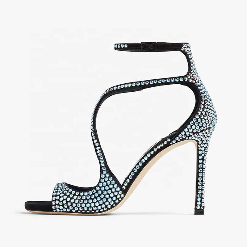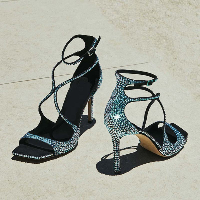 Sandales à bout carré ouvert pour femme, à brides croisées ornées de diamants, talon aiguille scintillant, design de marque, chaussures d'été