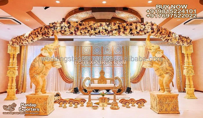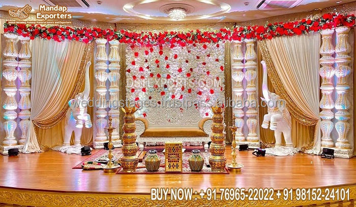 Scène de mariage ouverte avec piliers en cristal, décoration de scène de grande cérémonie de mariage Tamil, scène de réception de mariage Tamil, Californie