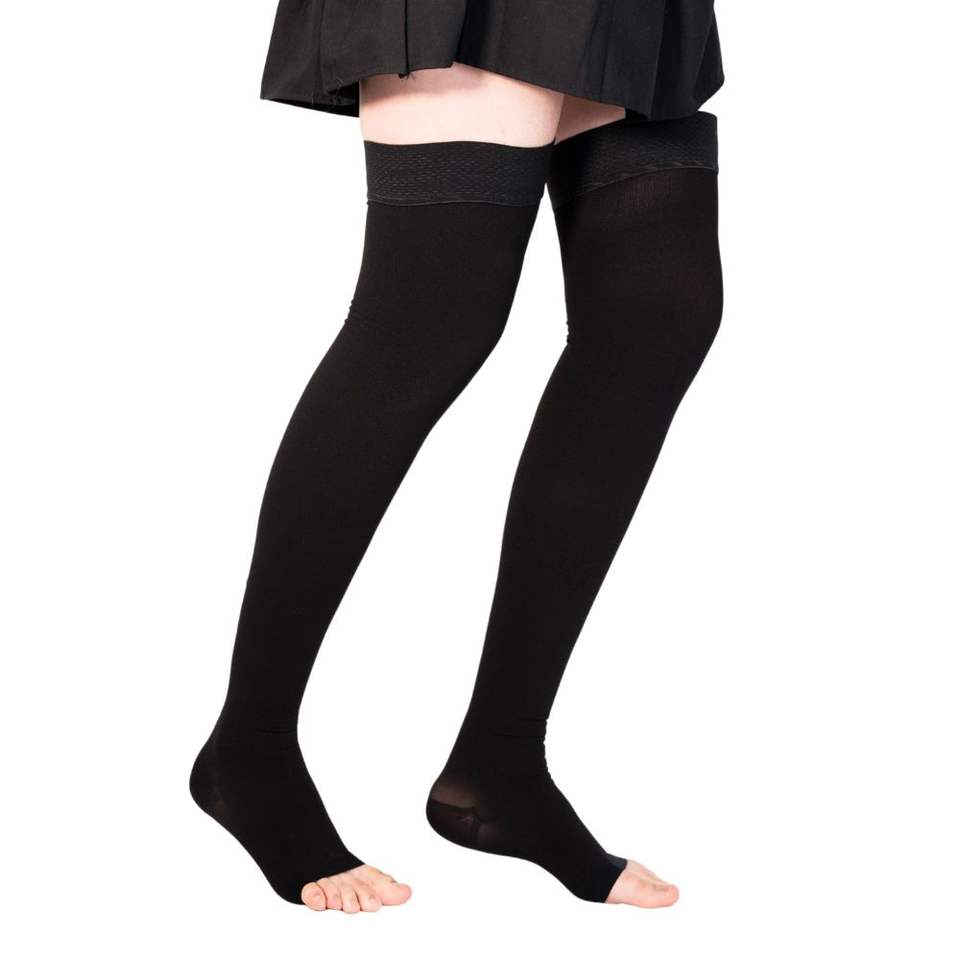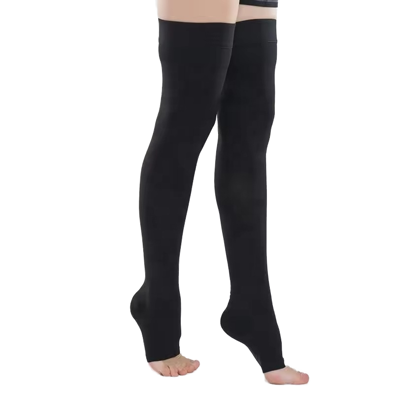 Bas de compression médical à bout ouvert classe 2 longueur de cuisse 20-30 MmHg bande supérieure en silicone Style de tissage tricoté