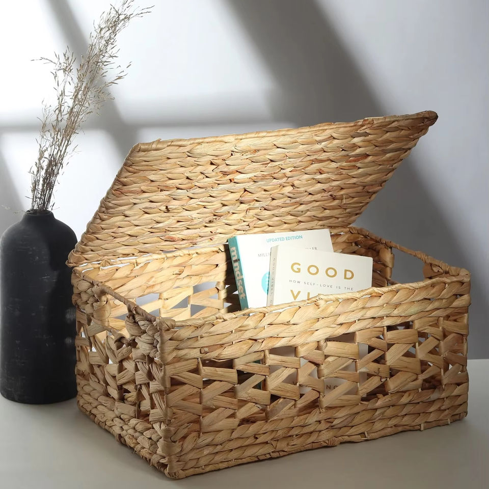 Boîte en jacinthe d'eau à tissage ouvert. Dimensions : L17,3 x L11,8 x H8 pouces.