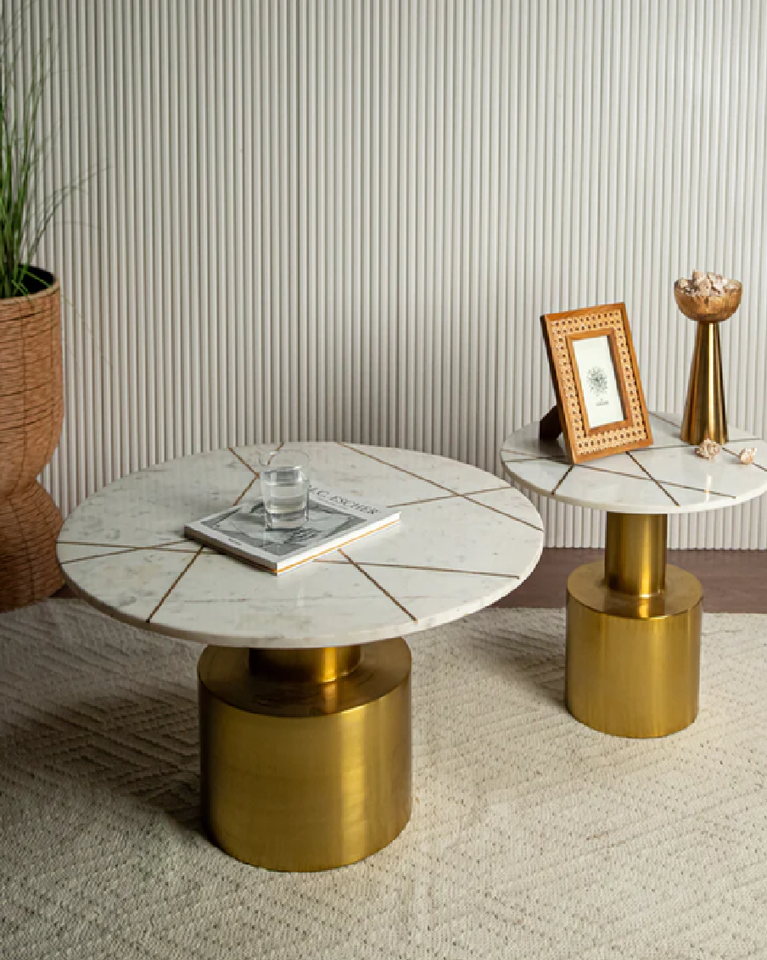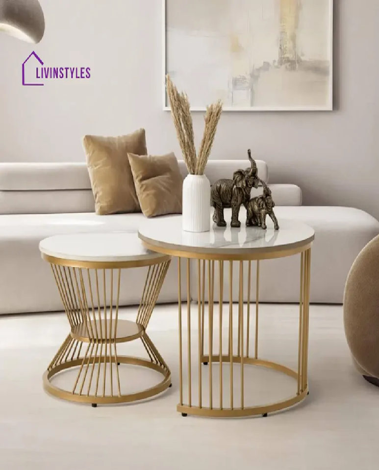 Optimisez votre espace avec nos tables basses gigognes chics, dotées de plateaux blancs et de bases polyvalentes en métal doré pour un look élégant.