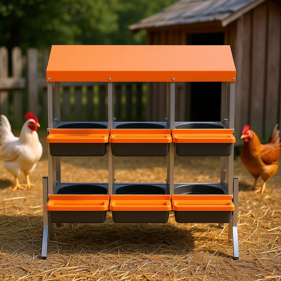 Orange Chicken Nesting Boxes 6 Compartments Galvanized Steel High Strength Plastic Egg Collection Poultry Equipment