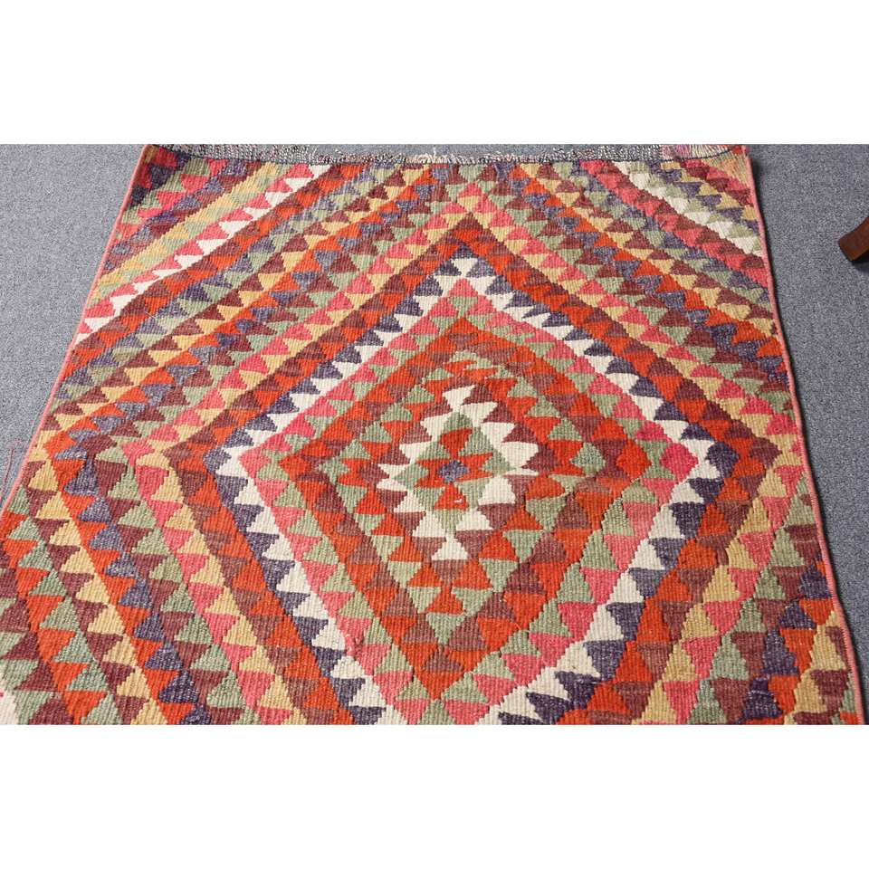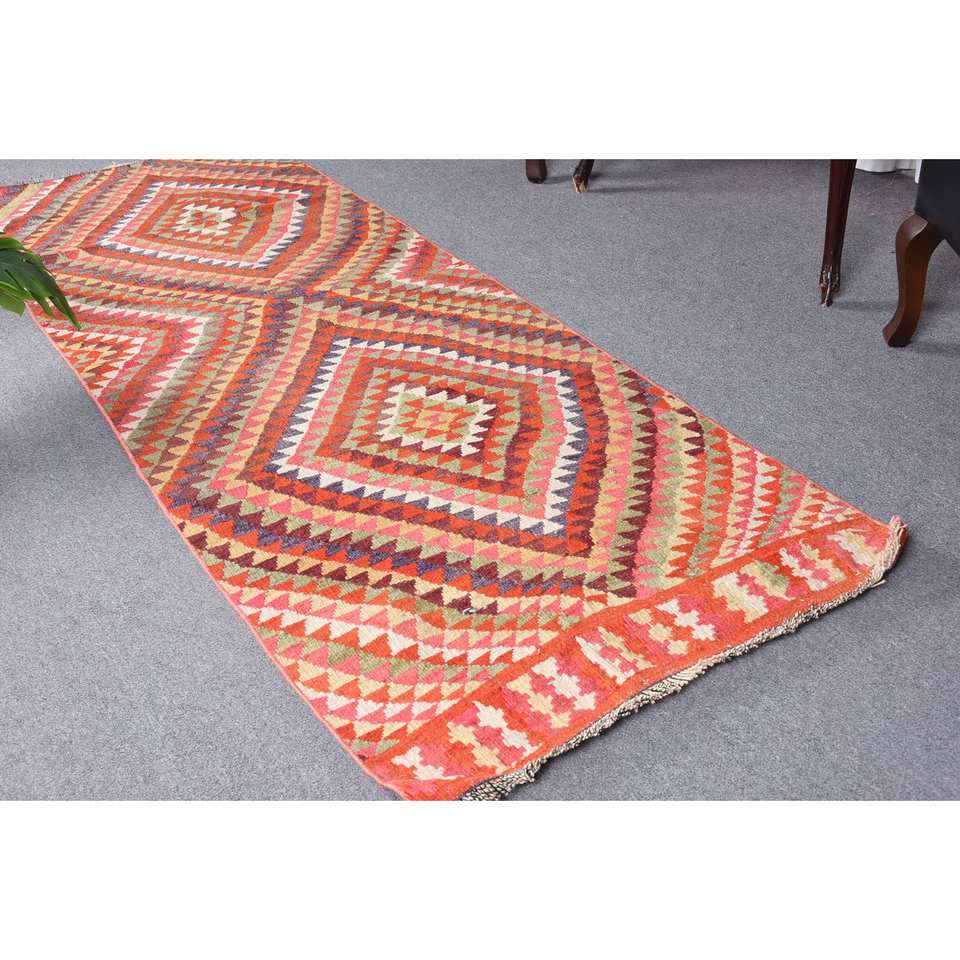 Tapis en laine Kilim vert orange 2.8x8 pieds tapis de salon à tissage plat turc motif de couloir rectangle en peluche avec support en latex