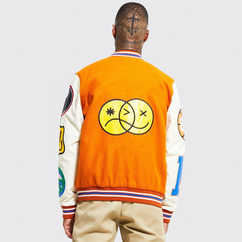 Veste universitaire d'hiver orange Patch, bomber coloré à lettres, style universitaire personnalisé, vêtements d'extérieur tendance, détails graphiques, imperméable