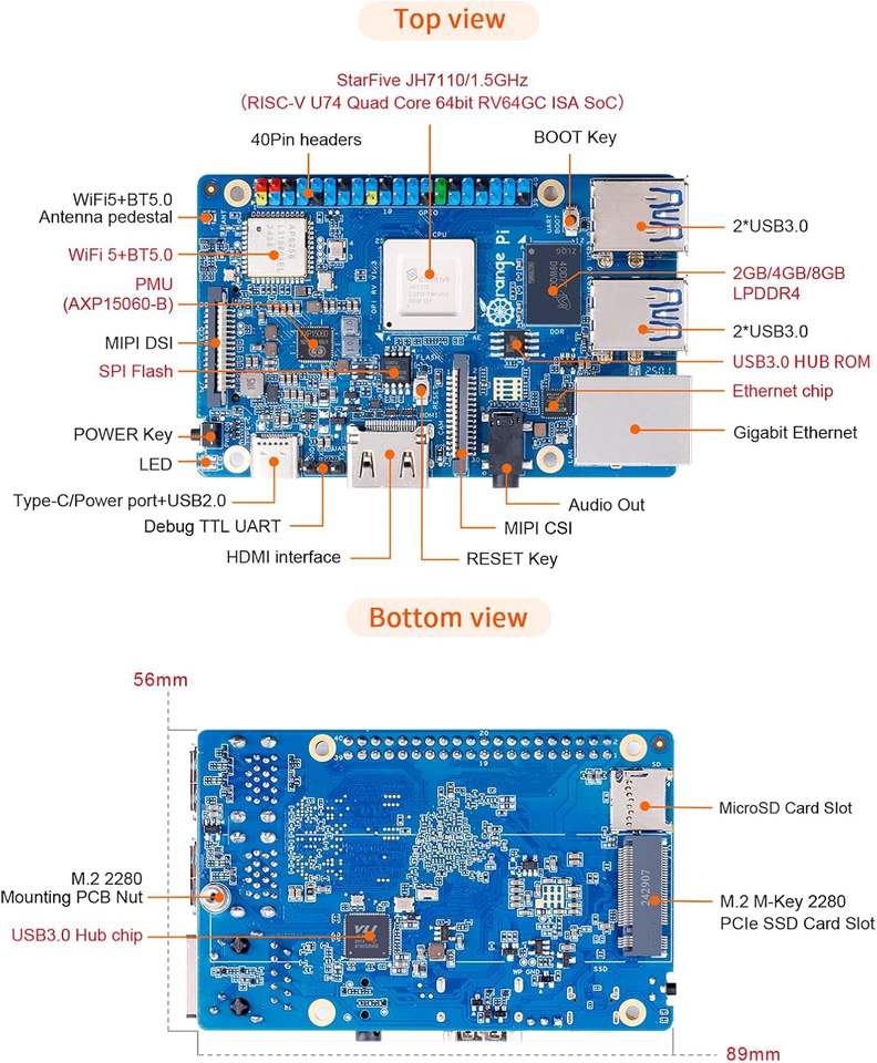 Orange Pi RV Ordinateur monocarte 8 Go RAM Quad-Core RISC-V LPDDR4 1,5 GHz Carte de développement Décodage vidéo 4K Wi-Fi 5+BT 5