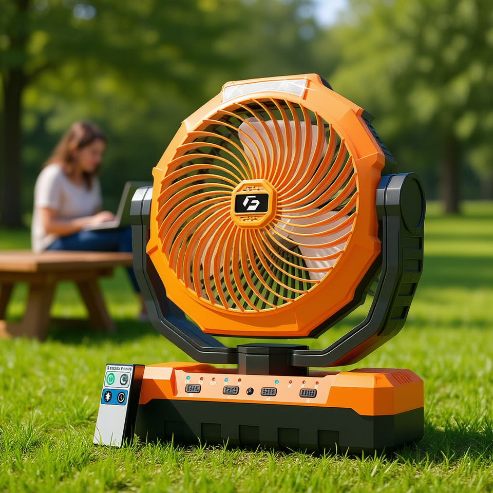 Ventilateur portable orange 9 pouces, batterie 12000 mAh, 4 vitesses, télécommande, pour la maison, le bureau et l'extérieur