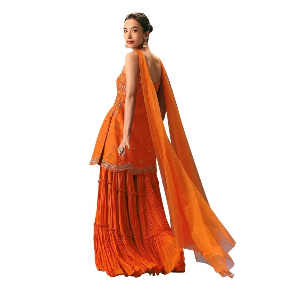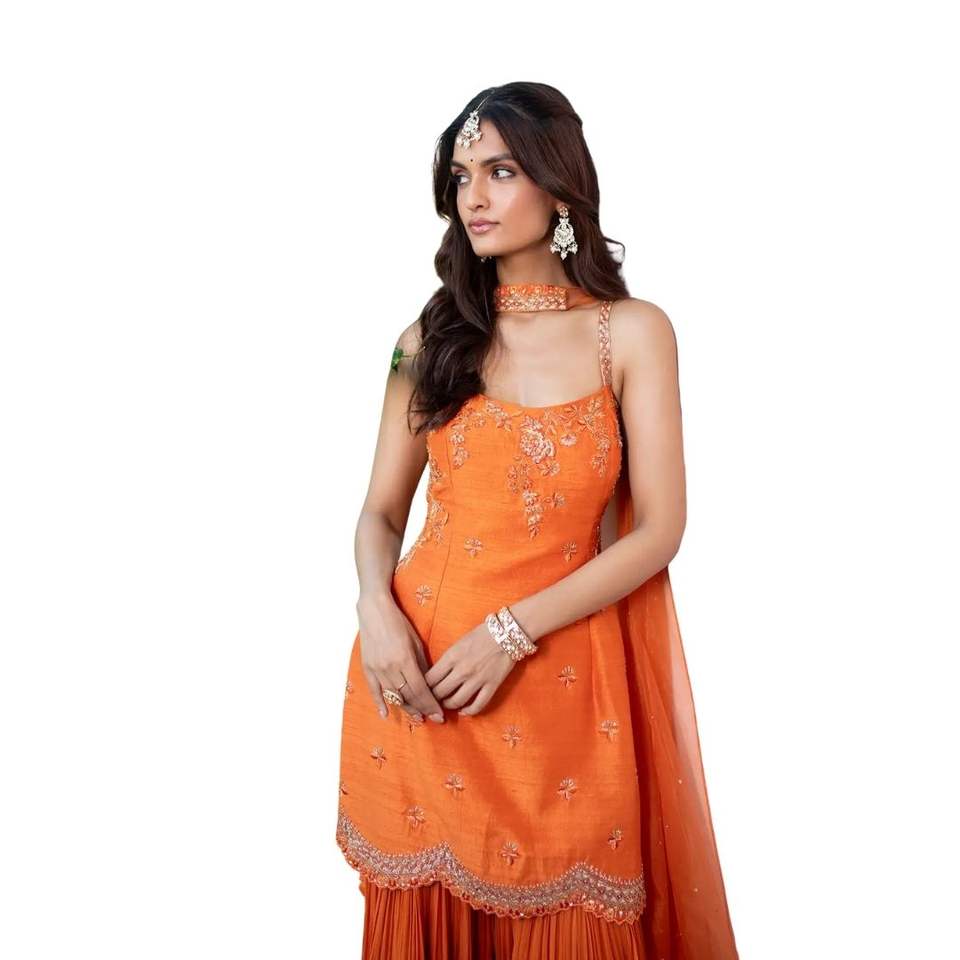 Ensemble de luxe Kurti Sharara en soie brute orange pour mariage et festival pour femmes élégantes